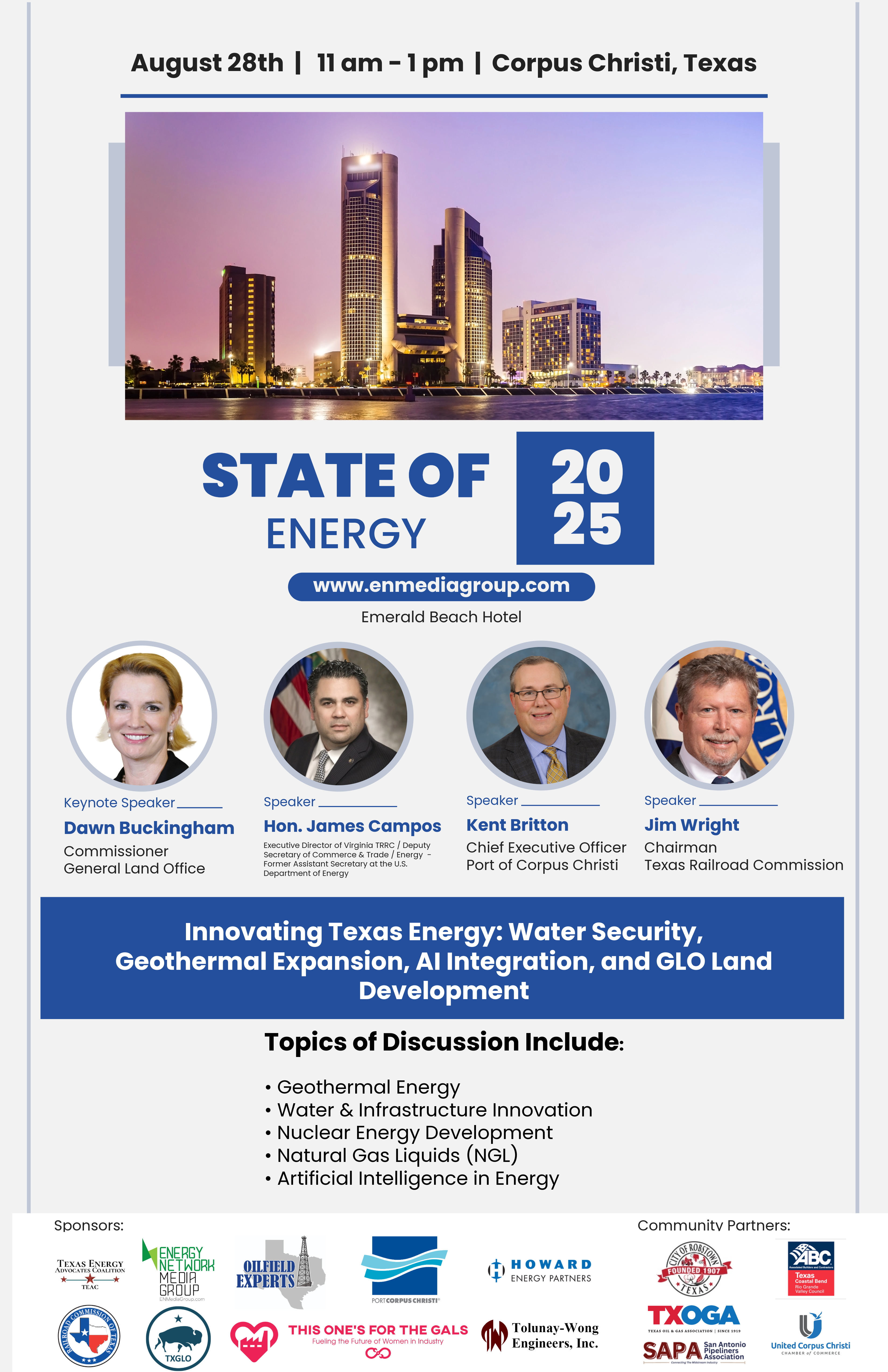 Emerald Beach Hotel 1102 S Shoreline Blvd, Corpus ChristiJoin Energy Network Media Group - SHALE Magazine and our very important guest speakers as we discuss the future of energy. We also will demonstrate the economic impact the oil and gas sector has on our region. Agenda: 11:00 am Doors open 11:35 am Opening Remarks Kym Bolado, Host of nationally syndicated radio show, “The […]